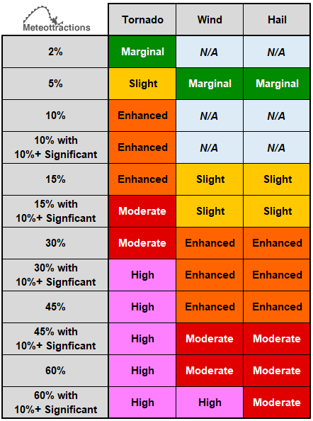 That gives us a good idea that the most likely threat is damaging winds but tornadoes and hail are still a notable possibility. How to best communicate that? That’s where the categories that the SPC uses come in. In part one, we discussed risk levels of Marginal (1 of 5), Slight (2 of 5), Enhanced (3 of 5), Moderate (4 of 5), and High (5 of 5). And those risk levels are assigned based on the probabilistic risks in each of the individual hazards shown above. Each percentage level of each hazard is assigned one of the five categories of risk, and a chart is referenced to determine which overall risk category to assign for the day.